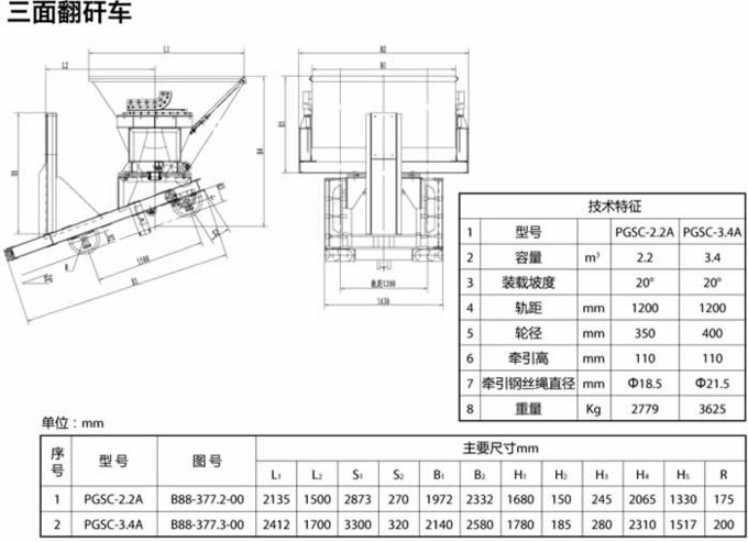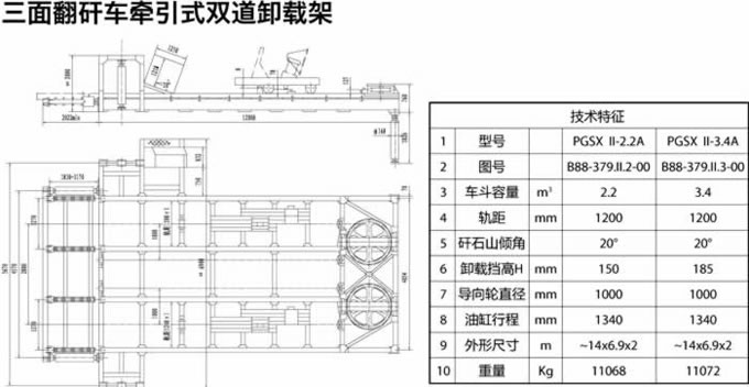 三面翻矸車用途: 排矸系統設備適用于矸石山裝卸矸石用。其生產工序為:重車出井由電機車推至翻車機車間,通過裝載扇形閘門卸入裝載設備,由絞車牽引至卸矸架卸矸,卸矸完成后絞車反轉,裝載設備行至裝載扇形閘門下部等待下一工序。